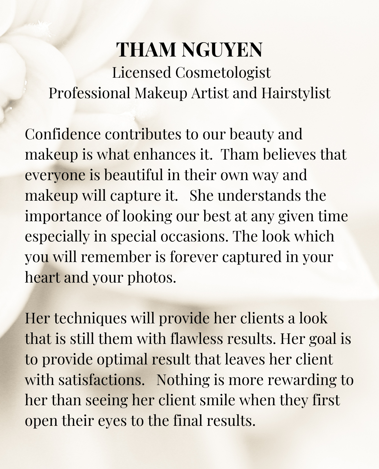 Tham is a Licensed Cosmetologist, Professional Makeup Artist and Hairstylist with over 14 years of experience.